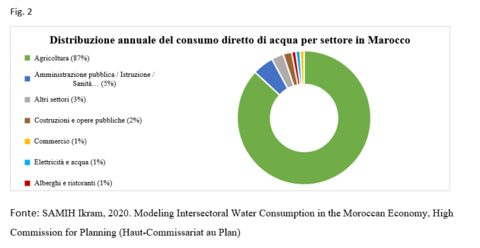 Questo livello di pressione sulle risorse idriche riflette un crescente squilibrio tra domanda e disponibilità, determinato dalla crescita demografica, dalle esigenze dell’agricoltura e dagli effetti dei cambiamenti climatici. Come mostra la figura 2, l’87% dei consumi idrici diretti nazionali è destinato all’agricoltura, un comparto che contribuisce per oltre il 12% al prodotto interno lordo (PIL) e impiega circa il 64% della forza lavoro rurale. Questa forte dipendenza dall’agricoltura non solo aumenta l’esposizione dell’economia marocchina alla variabilità climatica, ma mette anche in luce un aspetto cruciale: in Marocco, la governance dell’acqua coincide in larga misura con la governance dell’acqua in agricoltura. Di conseguenza, individuare soluzioni resilienti e adeguate al contesto per la gestione idrica nelle aree rurali rappresenta un imperativo sia sociale sia ambientale.