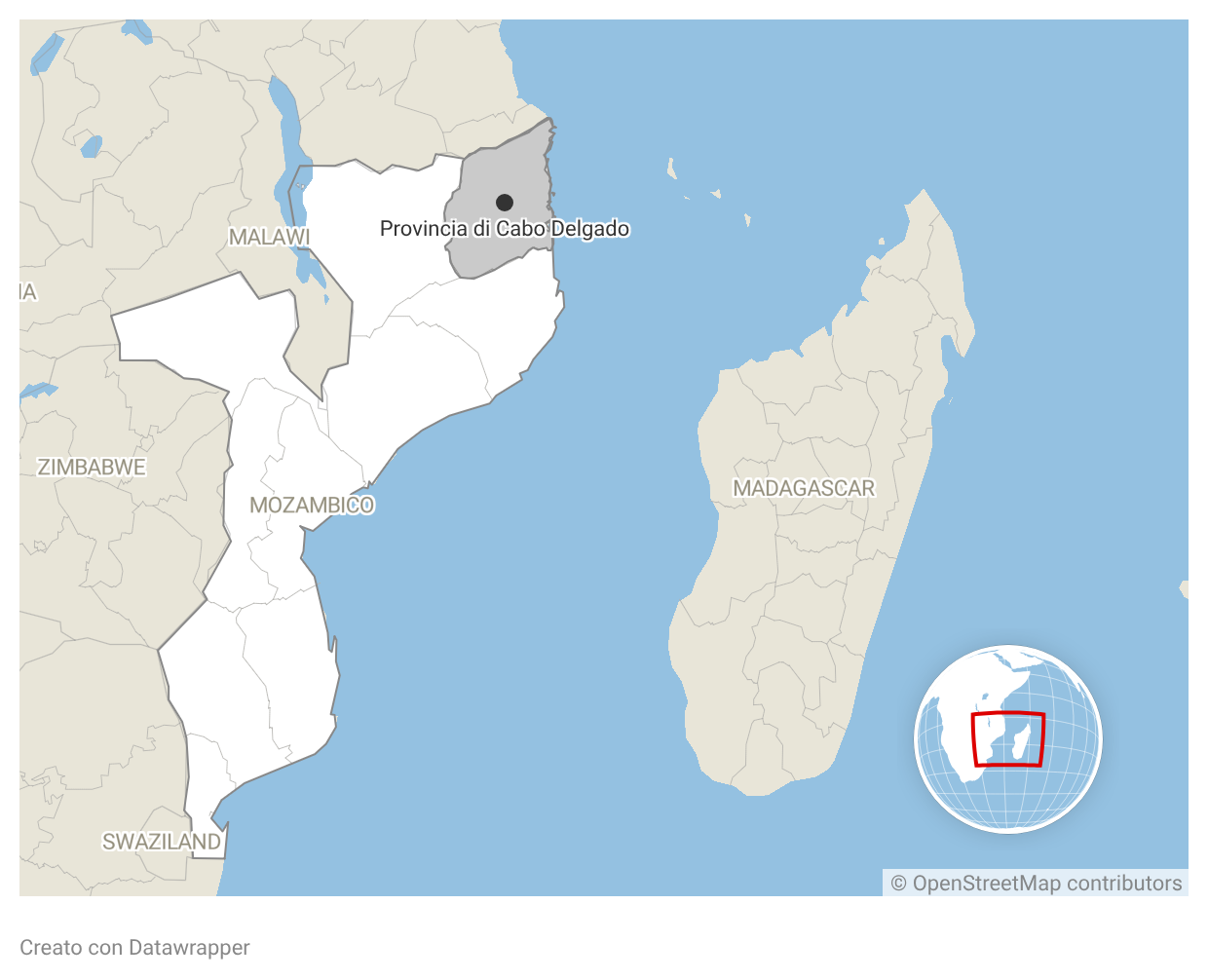 Secondo dati ufficiali, il conflitto in Cabo Delgado ha colpito oltre 1.000.000 di persone, generando circa 700.000 sfollati interni, provenienti in gran parte dai distretti di Mocímboa da Praia, Palma, Muidumbe, Nangade, Macomia, Quissanga, Ibo, Mueda e Meluco.