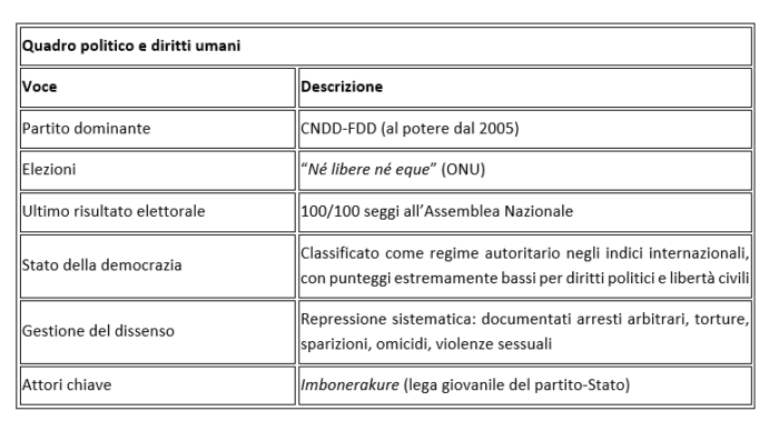 A fare da sfondo, i diritti umani negati. La democrazia è un miraggio in Burundi, la repressione del dissenso una costante. Il partito di governo (CNDD-FDD), al potere dal 2005, mantiene un controllo capillare sulle istituzioni, l’economia, la società tutta. Le elezioni di giugno, “né libere né eque” per le Nazioni Unite, gli hanno consegnato cento seggi su cento all’Assemblea Nazionale. Arresti arbitrari, sparizioni forzate, omicidi, violenze sessuali, torture soffocano ogni voce critica, reale o presunta. L’impunità resta la regola, sull’onda lunga della sanguinosa crisi del 2015.