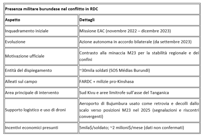 Negli ambienti di sicurezza regionali, poi, circolano ipotesi sull’esistenza di incentivi economici legati allo sforzo bellico burundese. Si parla di 5.000 dollari per soldato e di un contributo forfettario mensile sull’ordine dei 2 milioni. Una ricostruzione mai confermata, ma che restituisce la misura della posta in gioco.