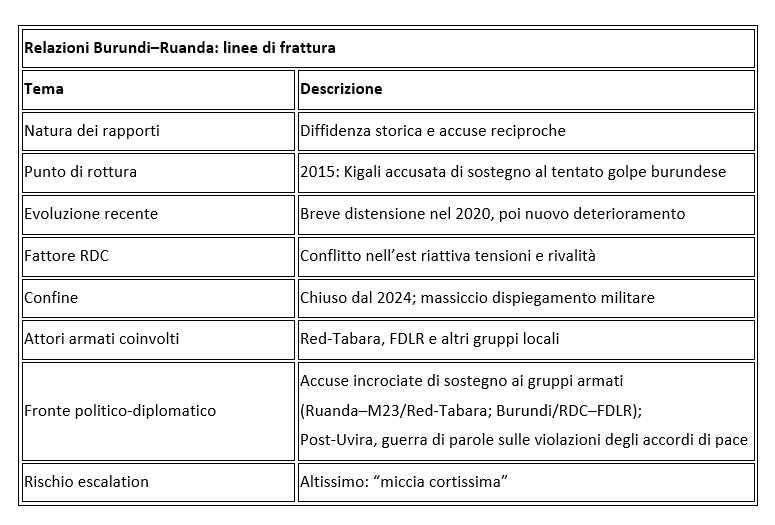 Il Burundi sostiene che il movimento tutsi Red-Tabara, che dal Sud Kivu punta a rovesciare Ndayishimiye, goda della copertura economica e militare del Ruanda. Il presidente ruandese Paul Kagame, dal canto suo, giustifica la propria condotta transfrontaliera con la necessità di contrastare le Forze democratiche per la liberazione del Ruanda (FDLR), combattenti hutu legati al genocidio del 1994, che Kinshasa e Bujumbura starebbero favorendo.