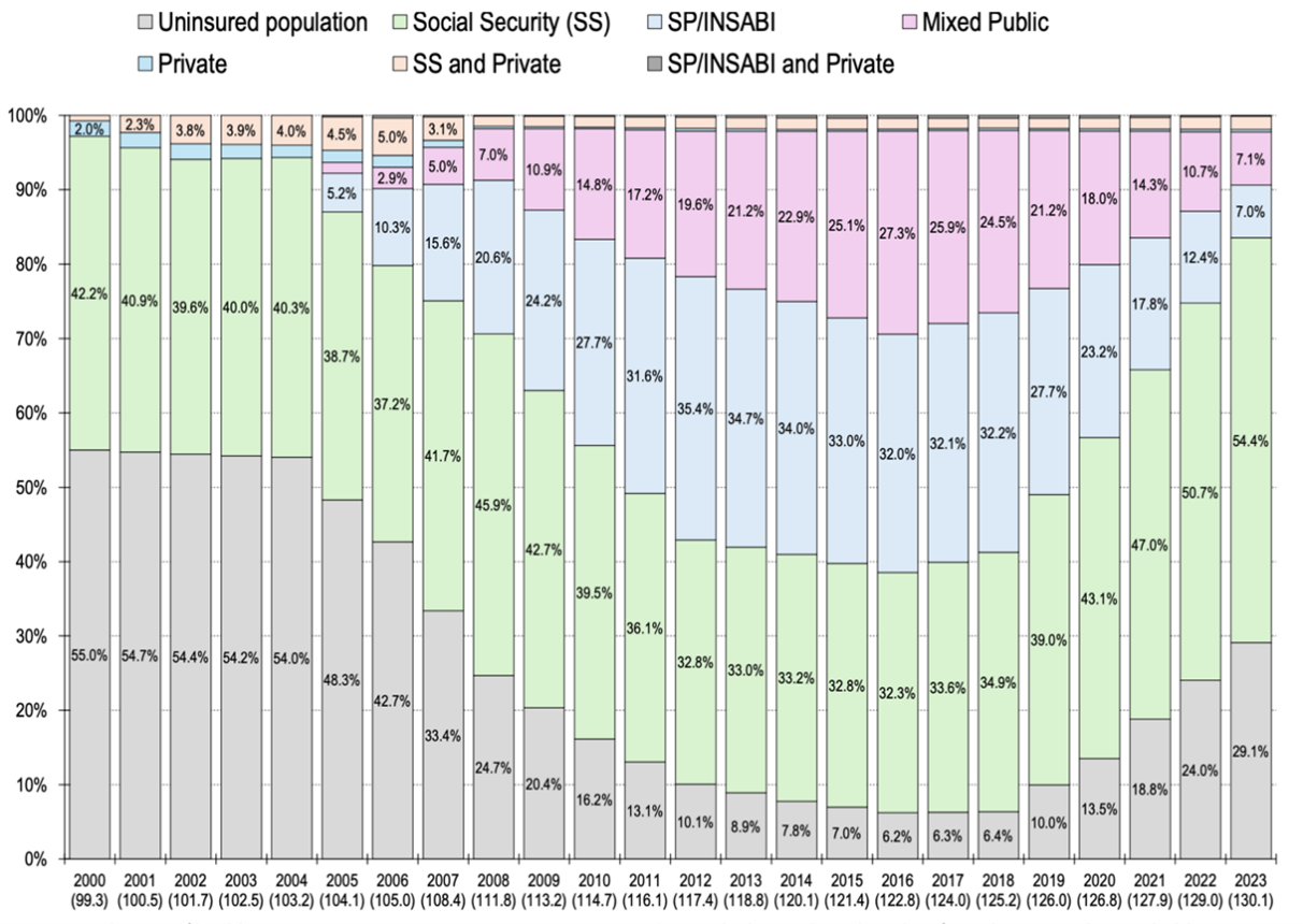 L’attuale governo sta tentando di superare questo modello assicurativo-privatizzato, finora però senza modificare di fatto la segmentazione dei servizi. Difatti, l’accesso subordinato dalla disponibilità di un lavoro formale e stabile risulta escludente in un paese con il 55.4% di attività lavorativa informale e precariato costante in cui il 38% degli assicurati perde l’assicurazione per la mancante stabilità lavorativa. Rispetto alla popolazione non assicurata, c’è una lunga storia di tentativi di aumentare la copertura sanitaria, rappresentata dal 2004 al 2019 dal Seguro Popular, un’assicurazione pubblica che permise di raggiungere il 94% di copertura della popolazione totale nel 2016. Questa copertura era gestita dai singoli stati, per cui nel 2019 fu sostituita dall’Instituto de Salud para el Bienestar (INSABI), e nel 2022 dall’IMSS-Bienestar, con l’obiettivo di centralizzare la gestione e rendere l’accesso alla salute gratuito e senza necessità di affiliazione assicurativa. Tuttavia, come si vede nella Tabella 2, lo smantellamento del Seguro Popular ha prodotto una riduzione di copertura assicurativa pubblica per le popolazioni non assicurate tramite il lavoro, dovuto alla complessità di centralizzare la gestione in un paese di grandi dimensioni. Complessità legate, per esempio, alla distribuzione di farmaci o all’adeguata informazione sull’accesso gratuito. Inoltre, la spesa pubblica per la sanità in Messico rimane una delle più basse rispetto ad altri paesi nella regione: 6% del PIL rispetto ad una media del 9% dei paesi dell’OCSE, rendendo la copertura pubblica esistente inadeguata alle necessità.